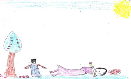 من البرنامج التجريبي حكاية شعبية من اليابان كان لآمر حصن ابنة جميلة تدعى (كوروهيم) وذات مساء ربيعي، اصطحب آمر الحصن ابنته الأميرة في رحلة للاستمتاع بقطف ثمار الكرز، كانت الطبيعة ساحرة، حيث بدت ذرى الجبال البعيدة وقد غطتها الثلوج، بينها افترشت اشجار الكرز ذات الثمار القرمزية التلال المحيطة