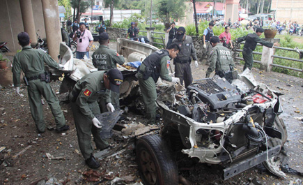 * ضبّاط من الشرطة التايلندية يُفتّشونَ موقعَ هجوم سيارة مفخَّخةِ في جنوب منطقةِ تاك التي شهدت هجمات متفرقة قام بها متمردون وأسفرت عن إصابات في صفوف رجال الأمن والمدنيين... رويترز *** * أفراد من الشرطة المحليّة الأفغانية يَنتظرونَ في طابور استعداداً لاستِلام راتبهم الشهري
