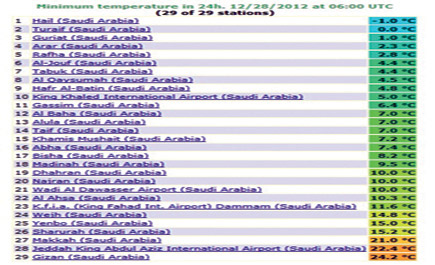 حائل - هايل العنزي: سجلت مدينة حائل صباح أمس الجمعة أدنى درجة حرارة بالمملكة حسب المواقع العالمية للرصد، حيث انخفضت مسجلة درجة واحدة تحت الصفر ووضعت مدينة حائل على قائمة المدينة الأشد برودة بالمملكة، بينما سجلت مدينة جازان الأقل برودة بالمملكة مسجلة 24 درجة مئوية، وتجدر الإشارة بأن عدداً
