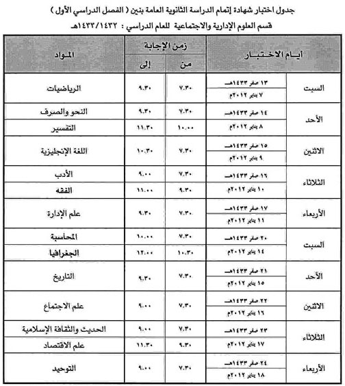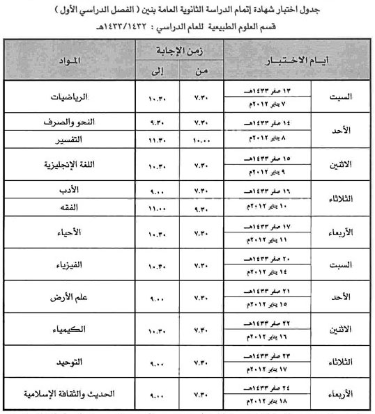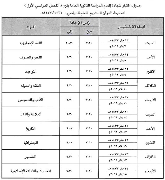 اعتمد المدير العام للتربية والتعليم بمنطقة الرياض الدكتور إبراهيم بن عبدالله المسند جداول اختبارات شهادة إتمام الدراسة الثانوية العامة بنين بجميع أقسامها للفصل الدراسي الأول للعام الدراسي 1432-1433هـ.