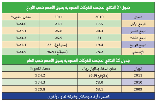 يوضح الجدول (1) نتائج الأعمال المجمعة للشركات خلال الأرباع الثلاثة الأولى لعام 2011م، والتي بلغت حوالي 73.4 مليار ريال .. وجاء الربع الثالث محققا أعلى أرباح ربعية بقيمة بلغت 25.9 مليار ريال، وبنسبة نمو بلغت 23.3% عن الربع المماثل لعام 2010م .. يليه الربع الثاني من عام 2011م الذي بلغت أرباحه حوالي 25.8 مليار ريال، بمعدل نمو وصل إلى 27.1% عن الربع المماثل من العام السابق (2010م) .. وجدير بالملاحظة أن أرباح أقل ربع لعام 2011م وهو الربع الأول التي بلغت 21.7 مليار ريال، فاقت قيمة أرباح أعلى ربع للعام السابق (2010م) وهو الربع الثالث .. أي أن أرباح كافة أرباع 2011م الثلاثة جاءت أعلى من كافة أرباع 2010م .. وتدور توقعات الربع الرابع لعام 2011م حول 23.5 مليار ريال، ومن ثم فمن المتوقع أن تصل الأرباح السنوية لعام 2011م إلى حوالي 96.9 مليار ريال، وبمعدل نمو يصل إلى حوالي 24.2% عن العام السابق (2010م).