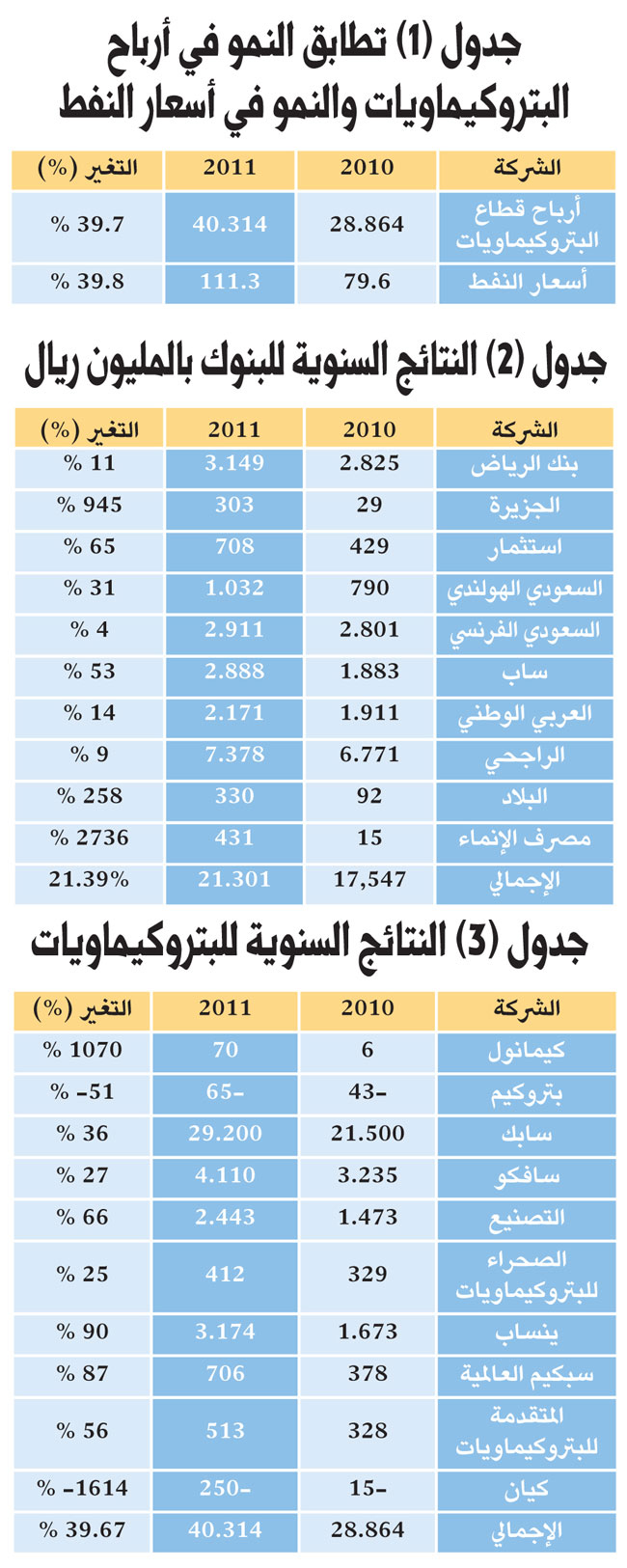 من الأمور المثيرة للانتباه في نتائج عام 2011م تطابق معدل النمو في أرباح قطاع البتروكيماويات مع معدل النمو في أسعار النفط، فأسعار النفط ارتفعت من 79.6 دولاراً للبرميل في عام 2010م إلى 111.3 دولاراً للبرميل في 2011م، أي أحرزت نموا بمعدل 39.8%.. الغريب أن قطاع البتروكيماويات (الشركات العشرة التي أعلنت عن نتائج أعمالها حتى الآن من بين الشركات الأربعة عشرة) قد حققت نمواً في صافي أرباحها السنوية من 28.9 مليار ريال في 2010م إلى 40.3 مليار ريال في 2011م، أيّ حققت نمواً بمعدل 39.7%، وهو معدل متساو مع معدل نمو أسعار النفط.. ولا ندري هل هذا التطابق عشوائي وحدث بالصدفة أم أن هناك ترتيباً قد تسبب في حدوثه؟.. وفي الاعتقاد أن هذا التطابق يرجع للصدفة البحتة.