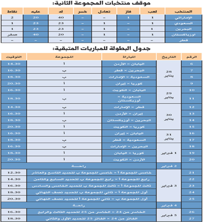 يلتقي المنتخبان السعودي والإماراتي الساعة السادسة والنصف في مباراة لا تقل شأناً عن سابقاتها ويدخل المنتخبان هذا اللقاء الثاني لهما حيث تعادلت السعودية في المباراة الأولى لها في افتتاح البطولة مع المنتخب البحريني ولم يقدم مستواه المعروف ويبرز في الفريق حارسه المبدع مناف آل سعيد ومهدي آل سالم وبندر الحربي وحسين الحبشي وأحمد العلي أما المنتخب الإماراتي فيدخل اللقاء الثاني له بعد أن اكتسح المنتخب الأوزبكي بفارق كبير ونتوقع أن تحفل المباراة بالندية وسيشكل حضور الجماهيري المتوقع مع منتخبنا حافزاً كبيراً لنجوم الأخضر.