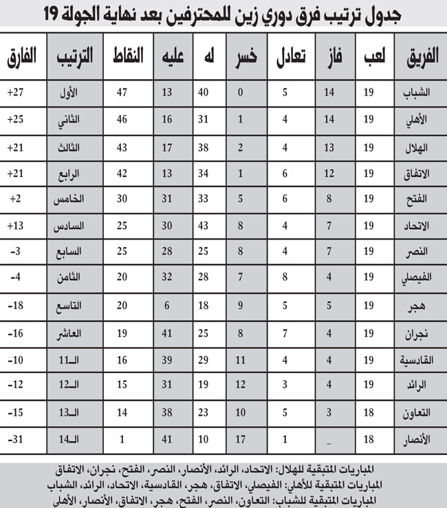 في جولة هي الأبرز والأكثر تغييراً وتقلباً أتت الجولة التاسعة عشرة بهذه الإثارة, هذه الجولة شدت الجماهير إليها رغم تبقي مباراة مؤجلة من الجولة, لكن الحدث الأبرز هو تنازل الأهلي عن صدارته ومنحها للشباب وكذلك لحاق الهلال بهما والاتفاق, وخروج الفتح بشكل مرضٍ لجماهيره بعد روحه العالية في مباراة الأهلي, وكذلك تألق إلتون وفايز السبيعي.
