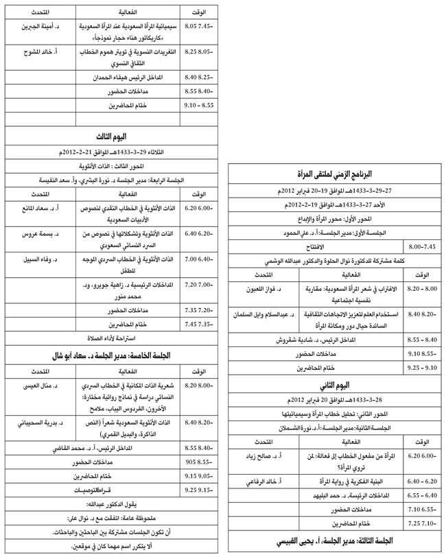 برعاية نائب وزير الثقافة والإعلام الدكتور عبدالله الجاسر تنظم جامعة الأميرة نورة بنت عبدالرحمن خلال الفترة من 27-29 ربيع الأول الموافق 19-21 فبراير 2012م ملتقى (المرأة والنص) والذي يقيمه كرسي بحث صحيفة الجزيرة للدراسات اللغوية الحديثة بجامعة الأميرة نورة، وذلك بالشراكة مع النادي الأدبي بالرياض.