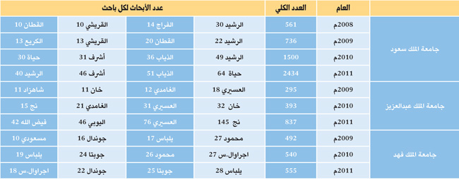 ويُعزى ذلك إلى زيادة متوسط عدد الأبحاث للباحثين النشطين بالجامعات السعودية، كما يبينه الجدول الآتي بموجب قواعد بيانات أي إس أي بتاريخ 1 ربيع الأول 1433هـ كما هو موضح بالجدول.