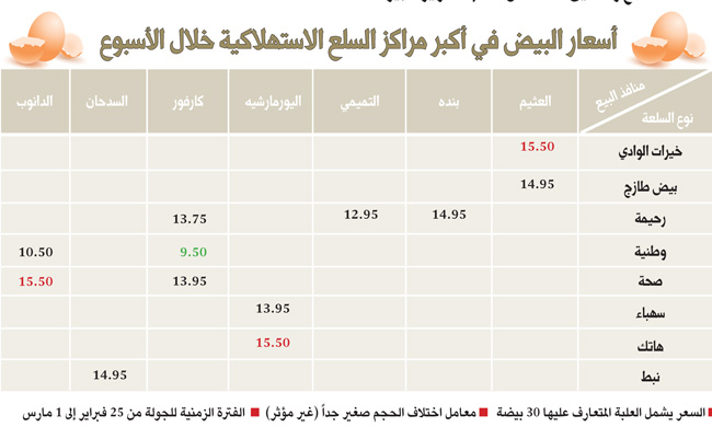 ما يخص السلعة محل استطلاعنا هذا الأسبوع (البيض)، فإن عامل غلاء المواد الخام على الشركات غير مؤثر في ظل الدعم الحكومي سالف الذكر، كما سبق أن تحدثنا عن عامل العرض والطلب وكيف أن لا مجال لندرة من خلال وفرة المعروض في مراكز التسويق خلال جولة «الجزيرة» الميدانية.