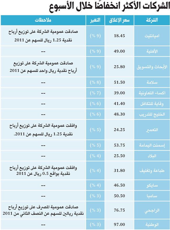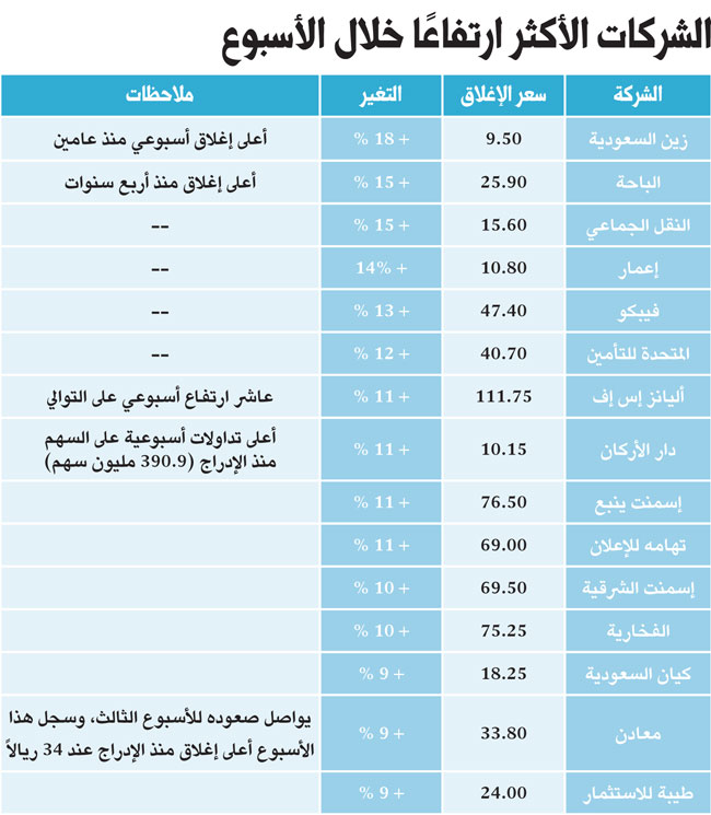 وتصدر سهم «زين» الأسهم الأكثر ارتفاعًا بنسبة 18 في المئة، تلاه سهم «النقل الجماعى» بنسبة 15 في المئة، فسهما «إعمار» و»دار الأركان» بنسبة 14 في المئة و11 في المئة على التوالي، وأنهى سهما «كيان» و»معادن» تداولاتهما الأسبوعية على مكاسب بـ9 في المئة. في حين كان سهما «اميانتيت» و»الأبحاث والتسويق» الأكثر انخفاضًا خلال الأسبوع بنسبة 9 في المئة، تلاهما «التعمير» بـ5 في المئة، وتراجع سهما «مصرف الراجحي» و»سامبا» بنسبة 3 في المئة.