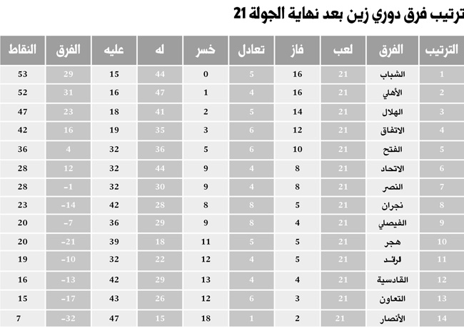 تتجدد الإثارة مرة أخرى بدوري زين السعودي مساء اليوم الخميس عندما تقام ثلاث مباريات ضمن الجولة الـ22، وكانت الجولة الماضية قد كشفت عن إضلاع المنافسة بشكل شبة نهائي باحتدام المنافسة بين الشباب والأهلي في صراع كبير من أجل الوصول للقب الدوري بفوزهما على النصر والاتفاق، واستمر الفارق على النقطة لصالح الأول، مع تعثر للفريق الهلالي في محطة الرائد ليبتعد بفارق ست نقاط عن المتصدر وخمس عن الوصيف، وسيلعب الفريق الشبابي مع الفتح في الرياض في مباراة تأكيد الصدارة على أن يستضيف الفيصلي نظيره الاتحاد في المجمعة فيما يلتقي نجران بالنصر في نجران.