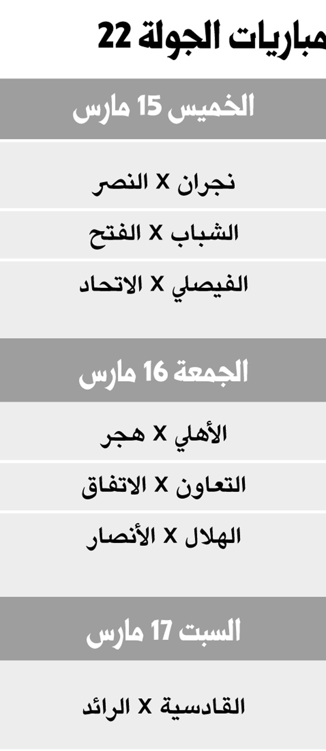 وفي نجران وعلى ملعب نادي الأخدود يلتقي نجران بالنصر في لقاء يهم الطرف النجراني بشكل أكبر والساعي لتأمين نفسه في سلم الترتيب وهرباً من أي خطر يهدده في الجولات الماضية، ويحتل الفريق المركز الثامن برصيد 23 نقطة بعد تعادله مع التعاون في الجولة الماضية بهدف لمثله، وشهد مستوى الفريق تحسناً ملحوظاً في الجولات الماضية وابتعد بفضلها قليلاً عن المؤخرة وصراع الهبوط، ويرغب في تأكيد ابتعاده والمشاركة في كأس الملك للأبطال، ويبرز في ا لفريق النجراني قائده السوري جهاد الحسين ورمزي بورقبة وعزان مقبول وصالح دويس وفريد شكلام وبندر مساعد، فيما سيفتقد الفريق لخدمات نجمه أحمد مفلح إلى جانب رضا الحاج.