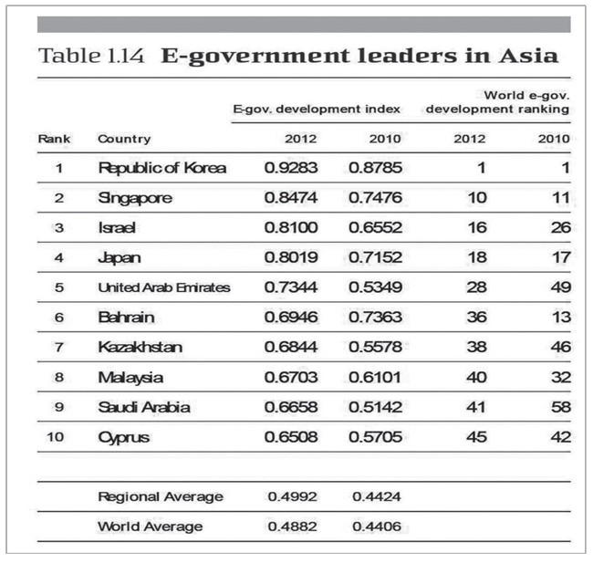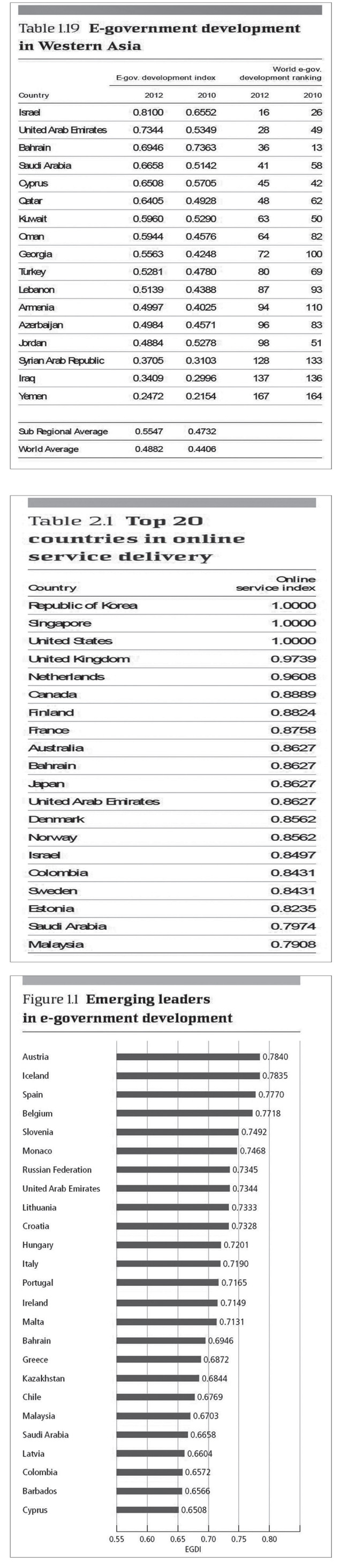 وكان تقرير قياس الأمم المتحدة للحكومة الإلكترونية لعام 2012 قد استعرض عدداً من التجارب الناجحة في غرب آسيا مؤكداً أن إحدى أهم تلك التجارب تتمثل في تحول المملكة العربية السعودية إلى التعاملات الإلكترونية الحكومية.