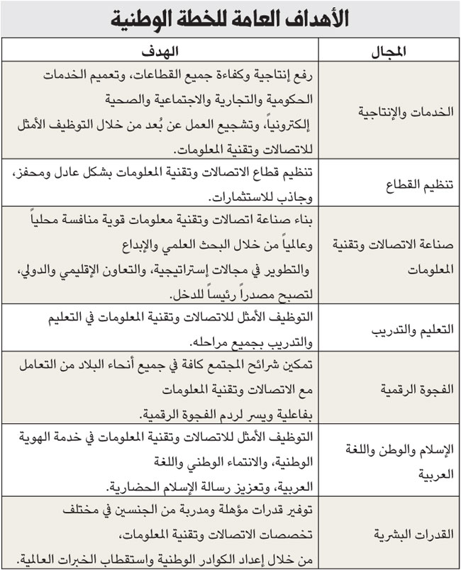 - كما هو معلوم فإن الخطة الوطنية للاتصالات وتقنية المعلومات تمَّ إقرارها في عام 1428هـ من قبل المقام السامي، ومسودتها رفعت قبل ذلك التاريخ بفترة، حيث تمّت دراستها من الجهات ذات العلاقة، ولا شك في أنه قد جرى كثير من التطور والتحديثات على مستوى العالم وعلى المستوى الإقليمي والمحلي في حقل الاتصالات وتقنية المعلومات، وهو حقل يمتاز بالتغير السريع كما هو معروف.