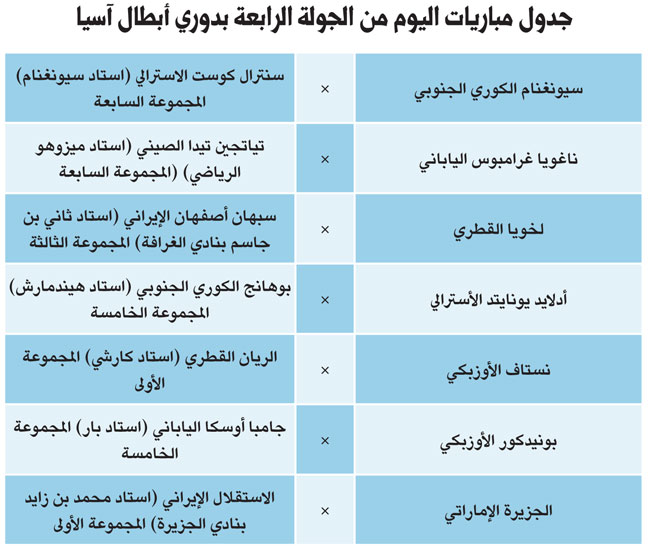 تختتم اليوم الأربعاء مباريات الجولة الرابعة من دوري أبطال آسيا لكرة القدم بإقامة 8 لقاءات لحساب المجموعات الأولى والثالثة والخامسة والسابعة، وسيخوض ممثلنا الفريق الأهلاوي مباراة صعبة للغاية أمام ضيفه النصر الإماراتي على ملعب استاد الأمير عبدالله الفيصل بجده لحساب المجموعة الثالثة والتي تتقارب فيها النقاط وتتكافأ الفرص للتأهل، وسيخوض الفريق الأهلاوي مباراته في نفس الملعب الذي خسر فيه الأهلي يوم الأحد الماضي لقب الدوري المحلي لحساب الشباب بعد التعادل الإيجابي بهدف لكل منهما...