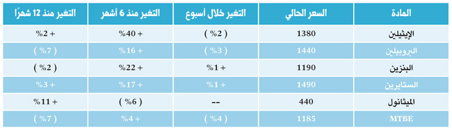 سجلت أسعار المواد تفاوتا كبيرا هذا الأسبوع، حيث تراجعت أسعار عدد من المواد الأساسية مثل الإيثيلين والبروبيلين، فيما سجلت أسعار الـMTBEتراجعا بنسبة 4%، مقارنة بالمستويات المرتفعة، التي وصلت إليها في الأسابيع الماضية.