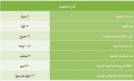 وقد تَشَكَّل هذا الحراك التطويري للتعليم العالي السعودي في منظومة ذات منهجية متكاملة تصب في تحقيق هدف مركزي وتوجه أساسي إستراتيجي ينتظم كل خطط الوزارة وبرامجها، وهو بناء مجتمع المعرفة والاستثمار في اقتصادياتها؛ ذلك أن التحدي الكبير الذي تواجهه مؤسسات التعليم العالي هو وجوب التحول المركزي في رؤيتها وأدوارها كي تصبح عنصراً فاعلاً ومؤثراً في تطوير (اقتصاديات المعرفة). ويأتي تدشين خادم الحرمين الشريفين مؤخرا للمراحل الأولى من مشروعات المدن الجامعية ووضع الحجر الأساس للمراحل الثانية بتكلفة 81,5 مليار ريال ليؤكد الدعم الكبير والمتابعة المستمرة من قبل القيادة الرشيدة للتعليم العالي وحرصها على الاستثمار في العنصر البشري الوطني المؤهل ما يعزز النهضة الشاملة التي تشهدها المملكة. وفي مجال البنى التحتية للمدن الجامعية وقعت وزارة التعليم العالي خلال هذا العام عقود مشاريع تنموية لإنشاء العديد من الكليات والمستشفيات في العديد من المدن الجامعية الجديدة بمختلف مناطق المملكة بتكلفة تصل إلى ستة مليارات ريال. وفي مجال معدلات القبول والالتحاق في التعليم العالي بوصفه المؤشر الأكبر لتوسع التعليم العالي تجاوزت نسبة الالتحاق بالتعليم الجامعي نسبة 90% من خريجي المرحلة الثانوية، حيث عملت الوزارة على تلبية الطلب المتزايد على التعليم العالي، وقد بلغ عدد الجامعات 32 جامعة حكومية وأهلية بعد أن كانت لا تتجاوز الإحدى عشرة جامعة قبل سبع سنوات، وبلغ عدد المقيدين 943.275 طالب وطالبة للعام الجامعي 1432/ 1433هـ، كما بلغ عدد الطلاب المستجدين في نهاية العام 1432/1433ه، 289.925 طالباً وطالبة، في حين بلغ عدد الخريجين 137.119 طالباً وطالبة. وسوف يؤدي نشر الجامعات في مختلف مناطق المملكة إلى تخفيف الضغط على الجامعات الرئيسة، مما يدعم التنمية المتوازنة بين المناطق. كما كان برنامج خادم الحرمين الشريفين للابتعاث فرصة ثمينة، وقناة حققت لأبنائنا وبناتنا طموحاتهم الأكاديمية، فكانوا سفراء لبلدهم حول العالم ومشاعل للحضارة العربية والإسلامية تضيء في العواصم العالمية حيث تجاوز عدد المبتعثين (130,000 ) الف مبتعث ومبتعثه في تخصصات يتطلبها سوق العمل المحلي مثل العلوم الصحية والهندسية و الإدارية .