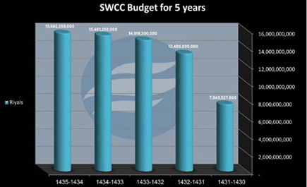 الدمام - ظافر الدوسري: كشفَ محافظ تحلية المياه المالحة عن ارتفاع ميزانية المؤسسة خلال السنوات الخمس الماضية بنسبة 100%, حيث بلغت للعام المالي 1434 - 1435هـ 15.7مليار ريال, في حين أنها بلغت عام 1430 - 1431هـ 7.6 مليار. وقال الدكتور عبد الرحمن آل إبراهيم إن رفع مخصصات تحلية