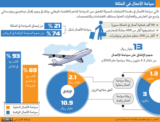 وقد كشف تقرير إحصائي حديث عن بلوغ إجمالي إنفاق الزوار على سياحة الأعمال الداخلية في المملكة 13 مليار ريال من خلال 4.3 مليون رحلة سياحية عام 2010م، وأوضح التقرير الصادر عن مركز المعلومات والأبحاث السياحية «ماس» في الهيئة العامة للسياحة والآثار أن رحلات سياحة الأعمال المحلية بلغت 1.3 مليون رحلة، أنفق خلالها الزوار 2.1 مليار ريال، أقام 69 % منهم في شقق مفروشة، فيما بلغت رحلات سياحة الأعمال الوافدة ثلاثة ملايين رحلة، أنفق خلالها الزوار 10.9 مليار ريال وسكن 93 % منهم في فنادق.