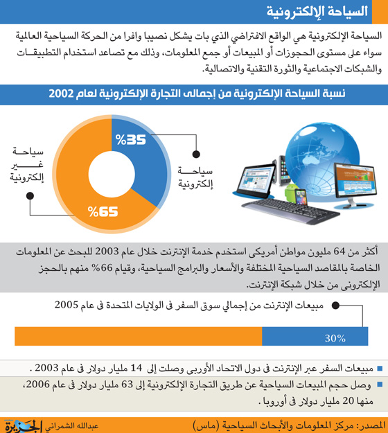 العريس « محمد « وعروسته «ثريا« يفكران في قضاء شهر عسل يتناسب مع فرحة العمر ؛ وقبل اتخاذ قرار بالوجهة التي سيطيران اليها انطلقا في عالم الانترنت للبحث والتقصي رغبة في معرفة دقيقة بالأماكن وتضاريسها ومميزاتها، وأسعار السفر إليها، والخدمات المتوافرة فيها، ومناخها، وطبيعة أهلها، والعروض المتاحة، وهما اثنان من ملايين الناس الذين يؤثرون ويتأثرون بالسياحة الالكترونية وما تتيحه للباحث من خيارات واسعة وسريعة .