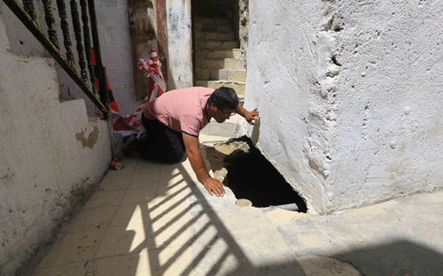 - مواطن فلسطيني مقدسي يتفقد آثار انهيار في أرضية حوش العسلية بباب السلسلة احد ابواب المسجد الاقصى المبارك، حيث أكَّد رئيس المحكمة العليا الشرعيَّة في فلسطين الشيخ يوسف ادعيس أن كافة المؤشرات والمعطيات تُؤكِّد أن انهيار المسجد الأقصى بات قاب قوسين أو أدنى نتيجة للحفريات الصهيونية المستمرة أسفله... الجزيرة.