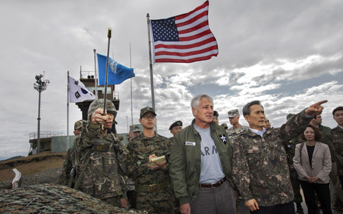 - يقوم وزير الدفاع الأمريكي تشاك هيجل بزيارة رمزية لقرية الهدنة المثقلة بالأسلحة على الحدود مع كوريا الشمالية مؤكداً أهميتها الإستراتيجية في الدفاع عن شبه الجزيرة الكورية...رويترز
