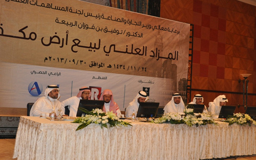 وكانت لجنة البيع التي أشرفت على مزاد «أرض مكة» قد ضمّت رئيس لجنة المساهمات العقارية وزير التجارة والصناعة الدكتور توفيق الربيعة، الدكتور خالد آل داود ممثل وزارة العدل، الدكتور إبراهيم الجضعي، الدكتور أحمد المغامس، عبد العزيز الغامدي، أمين عام اللجنة حمزة العسكر، وممثل قاضي التنفيذ في المحكمة العامة بمكة المكرمة.