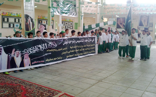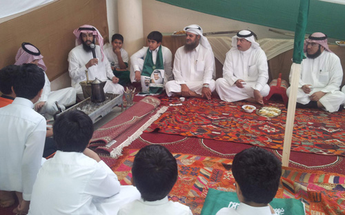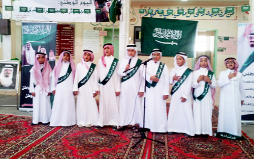وبعد ذلك توالت فقرات الحفل من أناشيد وطنية فردية وجماعية ومسابقات للخط العربي والرسم والخيمة الوطنية من إعداد المعلم صالح العجلان وعرض البوربونيت لموحّد المملكة أعده مركز المصادر بالمدرسة الأستاذ عبدالرحمن القحطاني.. بعد ذلك تم السحب على المسابقة الثقافية المعدة لهذه المناسبة وتوزيع الجوائز على المشاركين في إعداد هذا الاحتفاء.