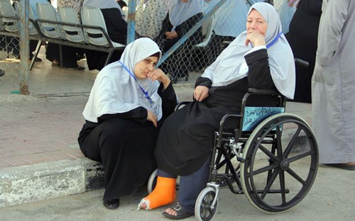 - حاجة فلسطينية على كرسي متحرك تنتظر مغادرة معبر رفح إلى المملكة العربية السعودية لأداء مناسك الحج. الجزيرة
