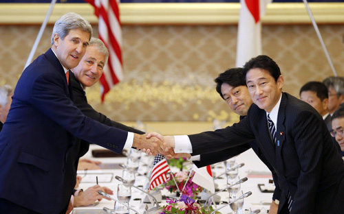 - وزيرا الخارجية والدفاع الأميركيان جون كيري وتشاك هيغل مع نظيريهما اليابانيين فوميو كيشيدا وايتسونوري اونوديرا في إطار اجتماع «2+2»، الأول في طوكيو. أ ف ب