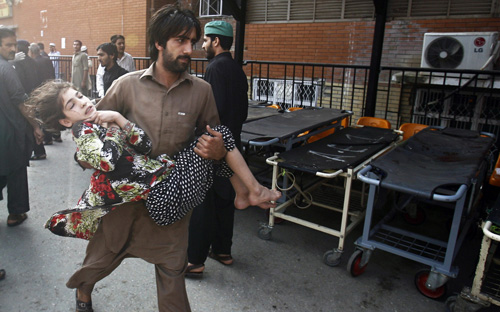 - رجل يحمل فتاة من ضحايا الانفجار الذي استهدف فريقًا طبيًا في مدينة بيشاور الباكستانية حيث وصل عدد القتلى إلى ستة مع وجود ثمانية جرحى يتلقون العلاج في المستشفى, وفقاً لما أكدت مصادر طبية... (رويترز)