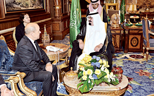 وفي بداية الاستقبال نقل معاليه لخادم الحرمين الشريفين تحيات وتقدير فخامة الرئيس فرانسوا اولاند رئيس الجمهورية الفرنسية ، فيما حمله الملك المفدى تحياته وتقديره لفخامته. عقب ذلك جرى استعراض عدد من الموضوعات ذات الاهتمام المشترك.