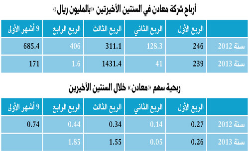 حققت شركة التعدين العربيَّة السعوديَّة «معادن» 1431.4 مليون ريال أرباحًا في الربع الثالث من العام الجاري، بفارق 1120 مليون ريال عن الربع المماثل من العام الماضي 2012م الذي كان 311.1 مليون ريال، فيما كان صافي ربح التسعة أشهر الأولى من العام الجاري 1711.6 مليون ريال مقابل 685.4 مليون ريال للفترة المماثلة من العام الماضي 2012م بفارق 1026.2 مليون ريال.