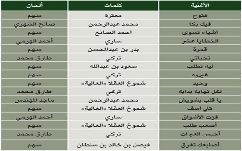 وفي العودة لـ»الخطايا عشر» حيث حصلت «الجزيرة» على المعلومات النهائية لهذا الألبوم، وعلى غلاف العمل، منذ نحو أسبوعين، ويضم ست عشرة أغنية تعاون من خلالها مع عدد من الشعراء والشاعرات كان نصيب الشاعر تركي أربعة أعمال والشاعرة شموخ العقلا «العالية» ثلاثة أعمال، وعملان مع الشاعر ساري ومثلهما مع الشاعر محمد عبدالرحمن، فيما جدد تعاونه مع الأمير بدر بن عبدالمحسن والشاعرة معتزة، والشعراء أحمد الصائغ، سعود بن عبدالله وفيصل بن خالد بن سلطان.