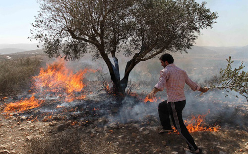 - مواطن فلسطيني يحاول إخماد النيران التي اشعلها المستوطنون الصهاينة في مزارع الفلسطينيين ..الجزيرة