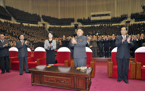 - الزعيم الكوري الشمالي كيم يصفّقُ وبجانب زوجتِه ري سول جو أثناء أداء فرقة موسيقية عسكرية خاصة احتفالا بالذكرى الثامنة والستّين لحزبِ العُمّال في كوريا الشمالية..رويترز