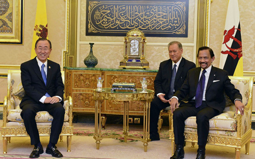 - سلطان بروناي والامين العام للامم المتحدة بان كي مون اثناء اجتماعهم في احد القصور الملكية في مدينة بندر سيري بيجوان...رويترز