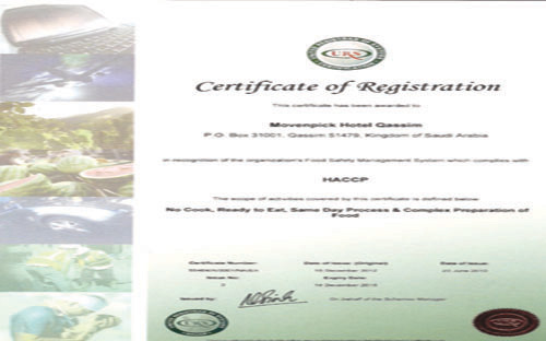 انطلاقاً من سياسة شركة موفنبيك للفنادق والمنتجعات العالمية ومسئولية الفندق تجاه ضيوفه الكرام وإيماناً بدوره الرائد في تطوير نظم سلامة وصحة الغذاء قامت إدارة الفندق بتطبيق نظام تحليل المخاطر ونقاط المراقبة الحرجة وهو نظام دولي للتأكد من صحة وسلامة الأغذية والمشروبات المقدمة في فندق موفنبيك القصيم بمدينة بريدة ولهذا النظام العديد من المزايا منها وجود جهات متخصصة في الرقابة والتفتيش على جودة الاغذية والمشروبات وبدون هذا النظام تزداد مخاطر أعداد وبيع الأطعمة غير الآمنه ولهذا حرصت إدارة فندق موفنبيك القصيم على الحصول على أعلى شهادات الجودة في هذا المجال وهي شهادة من كبرى شركات الجودة العالمية شركة ( U R S ) حرصاً منها على صحة وسلامة ضيوفها وعملائها.