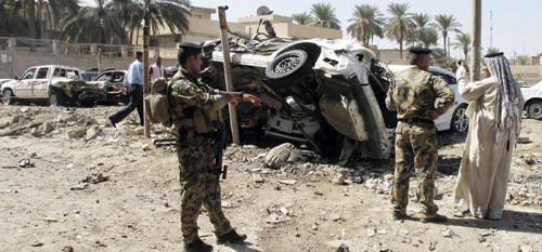 - رجل أمن عراقي يستمع لشاهد عيان في موقع تعرّض لهجوم بسيارة مفخخة يوم أمس ...(أ ف ب)