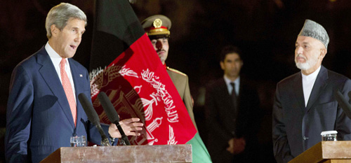 - الرئيس الأفغاني حامد قرضاي ووزير الخارجية الأمريكي جون كيري أثناء مؤتمر صحفي أقيم بقصر الرئاسة في كابول حيث وصل كيري إليها في زيارة لم يلعن عنها ... (أ ف ب)