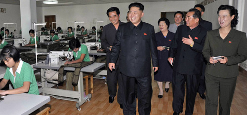 - زعيم كوريا الشمالية كيم ومسؤولون كبار في نظامه أثناء زيارتهم لمصنع منسوجات تابع للقوات المسلحة في العاصمة بيونج يانج .. (رويترز)