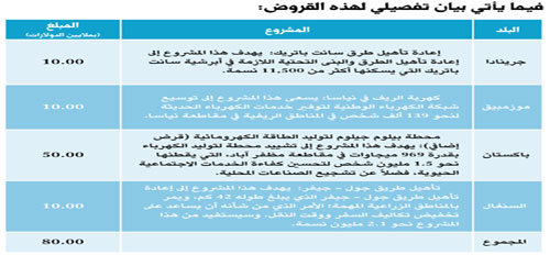 وعلى هامش هذه الاجتماعات السنوية وقع السيد الحربش اتفاقيات قروض جديدة، تبلغ قيمتها 80 مليون دولار أمريكي مع وزراء أربعة من البلدان الشريكة في إفريقيا وآسيا ومنطقة البحر الكاريبي، هي السنغال وموزمبيق وباكستان وجرينادا. وتعليقاً على هذه القروض الجديدة، قال السيد الحربش إن «اتفاقيات القروض التي وُقعت على هامش اجتماعات البنك الدولي وصندوق النقد الدولي ستقطع شوطاً كبيراً في طريق التقدم نحو التخفيف من حدة الفقر ورفع مستوى المعيشة لملايين الناس». وأوضح أن هذه المشاريع ستساعد في تعزيز قطاعات النقل والطاقة في البلدان المستفيدة.