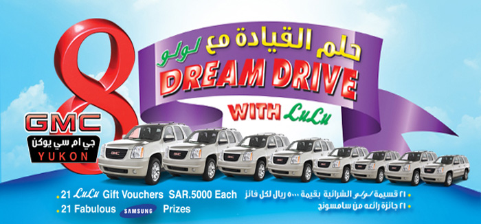 سيتم إجراء السحب الكبير لمسابقة (حلم القيادة) يوم الخميس 24 /10 /2013 الساعة 7:30 مساء بأسواق لولو السعودية الكبرى في الرياض والخبر وذلك بحضور الممثلين الرسميين الغرفة التجارية وسيمنح الفائزون 8 سيارات جي إم سي وكثير من الجوائز الرائعة .