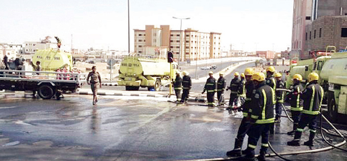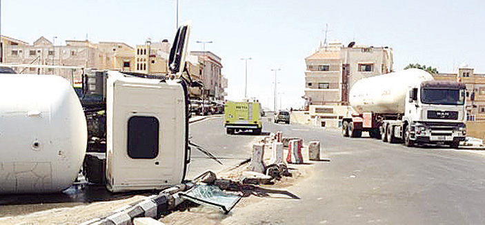 وكانت قد تبلغت عمليات الدفاع المدني الساعة 11.18 صباح أمس الأربعاء عن انقلاب وايت توزيع غاز تابع لشركة الغاز والتصنيع الأهلية بمحافظة الطائف على كوبري الحلقة شمال المحافظة.