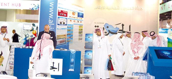 - زوار جناح مؤسسة (الجزيرة) يتعرفون على التقنيات التي تقدمها في مجال الإعلام.