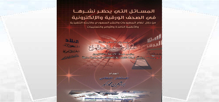 من إعداد المستشار النظامي إبراهيم بن محمد أكبر، صدر كتاب «المسائل التي يحظر نشرها في الصحف الورقية والإلكترونية»، وقد قدّم للكتاب الأستاذ عبد الرحمن بن عبد العزيز الهزاع رئيس هيئة الإذاعة والتلفزيون رئيس لجنة النظر في المخالفات الصحفية سابقاً.