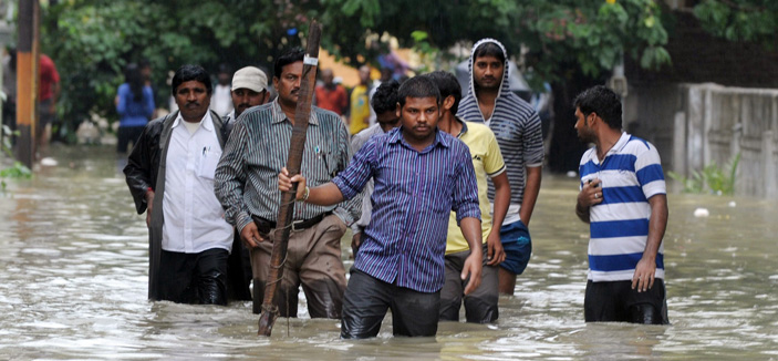* مجموعة من سكان مدينة حيدر أباد الهندية يعبرون أحد الطرق التي غمرتها مياه الأمطار الغزيرة التي تشهدها البلاد هذه الأيام... أ ف ب