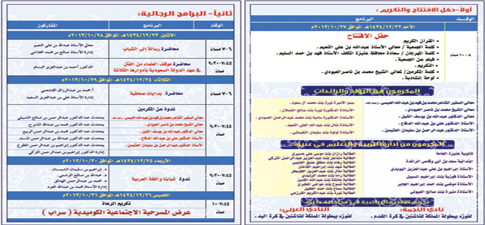 تنطلق فعاليات مهرجان عنيزة الثقافي الرابع مساء اليوم الأحد وتستمر لمدة خمسة أيام التي تتضمن عددا من المحاضرات والندوات الثقافية وورش عمل يشارك فيها نخبة من الأدباء والمختصين منهم معالي الأستاذ عبد الله بن علي النعيم و الدكتور أحمد بن عبد العزيز البسام والأستاذ محمد عبد الرزاق القشعمي والدكتور عبد الرحمن بن صالح الشبيلي والدكتور محمد بن عبد الله المشوح و الدكتور محمد بن عبد الرحمن الربيع والدكتور عبد الله بن عبد الرحمن المسند والدكتور إبراهيم بن عبد الرحمن المطوع والدكتور إبراهيم بن سليمان الشمسان والدكتور عبد الله بن صالح الوشمي والدكتور محمد بن عبد الرحمن الهدلق . فيما ستنطلق الفعاليات النسائية مساء غدٍ الاثنين الموافق 23 /12 /1434 وتسمر لمدة أربعة أيام ويشارك في الفعاليات النسائية الدكتورة أمل بنت عبد الله سليمان الطعيمي والدكتورة نورة بنت إبراهيم ناصر الصويان والدكتورة لولوة بنت صالح رشيد الرشيد.والدكتورة أشجان بنت محمد حسين عبدالله هندي .