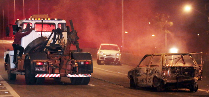 - محتجون في البرازيل يقومون بإحراق سيارة تابعة للشرطة بعد حادثة تورط أحد أفراد الأمن بقتل طفل في أحد أحياء سوباولو ... ا ف ب