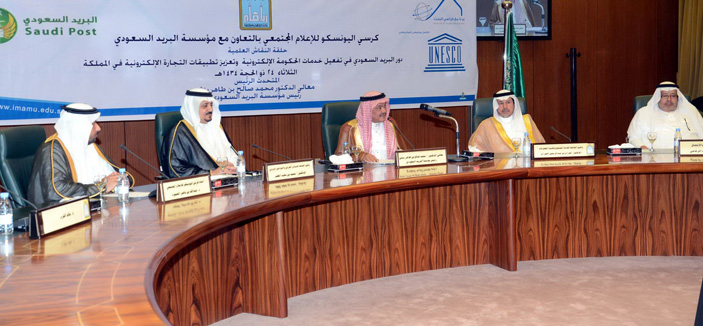 أقام كرسي اليونيسكو للإعلام المجتمعي بجامعة الإمام محمد بن سعود الإسلامية، أمس الثلاثاء، حلقة نقاش علمية بالتعاون مع البريد السعودي بعنوان «دور البريد السعودي في تفعيل خدمات الحكومة الإلكترونية وتعزيز تطبيقات التجارة الإلكترونية في المملكة»، تحدث فيها معالي رئيس مؤسسة البريد السعودي الدكتور محمد صالح بن طاهر بنتن, بحضور وكيل الجامعة للتبادل المعرفي والتواصل الدولي الدكتور محمد بن سعيد العلم ووكيل الجامعة لخدمة المجتمع وتقنية المعلومات الدكتور فوزان بن عبدالرحمن الفوزان وأستاذ كرسي اليونيسكو للإعلام المجتمعي الدكتور عبدالله بن ناصر الحمود، وعميد كلية الإعلام والاتصال الدكتور عبدالله الرفاعي، وعميد كلية علوم الحاسب والمعلومات الدكتور عيسى العيسى، وعميد كلية الاقتصاد والعلوم الإدارية الدكتور سليمان الصغير، وعدد من أعضاء هيئة التدريس والمهتمين، وذلك في القاعة المستديرة بمبنى المؤتمرات بالجامعة.