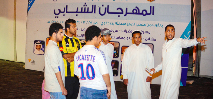 تتواصل مساء اليوم الخميس فعاليات المهرجان الشبابي والمقام بجوار مدينة الأمير عبد الله بن جلوي الرياضية بالأحساء تحت إشراف الرئاسة العامة لرعاية الشباب، وبرعاية من صاحب السمو الملكي الأمير نواف بن فيصل بن فهد بن عبد العزيز آل سعود، الرئيس العام لرعاية الشباب والذي تم افتتاحه مساء أمس الأربعاء ويستمر لمدة عشرة أيام، حيث تشهد فعاليات هذا المساء من الفترة الأولى منافسات وبرامج المهرجان اليومية التي تشمل سداسيات كرة القدم وكرة الطائرة والملعب الصابوني والرسم الجداري وقرية ألعاب الشباب والعديد من المنافسات الشبابية، وفي الفترة تقديم الدورات التدريبية، فيما يحل الشيخ طارق الحواس ضيفاً على الخيمة الرئيسية في الفترة الثالثة، وسيكون الموعد مع عروض الكلاب البوليسية وعروض السيارات والدراجات وعروض الرول سكيت وألعاب ومسابقات مع فرقة سالك التطوعي في الفترة الرابعة، وسيكون ضيف المهرجان مساء اليوم الفنان بشير الغنيم.