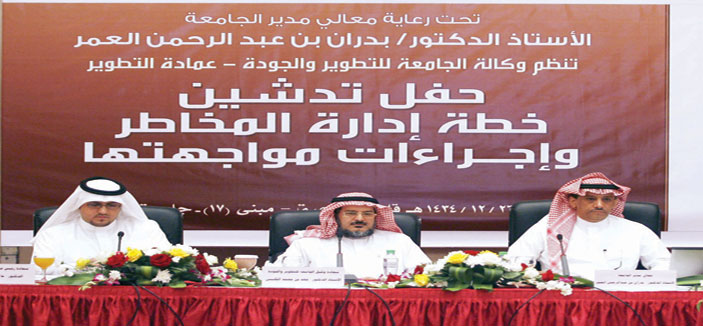 وبدأ الحفل بالقرآن الكريم، ثم ألقى وكيل الجامعة للتطوير والجودة الدكتور فهد الكليبي كلمة، ذكر فيها أن أي مؤسسة تعليمية تُعنى بأهمية المخاطر، ويكون لها خطة استراتيجية لدرء المخاطر المحتمل وقوعها.